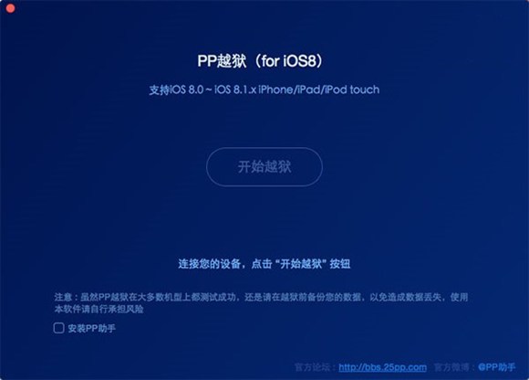 Mac版PP越獄工具版本為1.0,支持Mac OS X 10.7或更高版本操作系統。用戶下載後拖拽安裝即可。首次運行可能會出現安全提醒,修改系統偏好設置>>安全性與隱私>>允許從任何來源下載的應用程序即可。