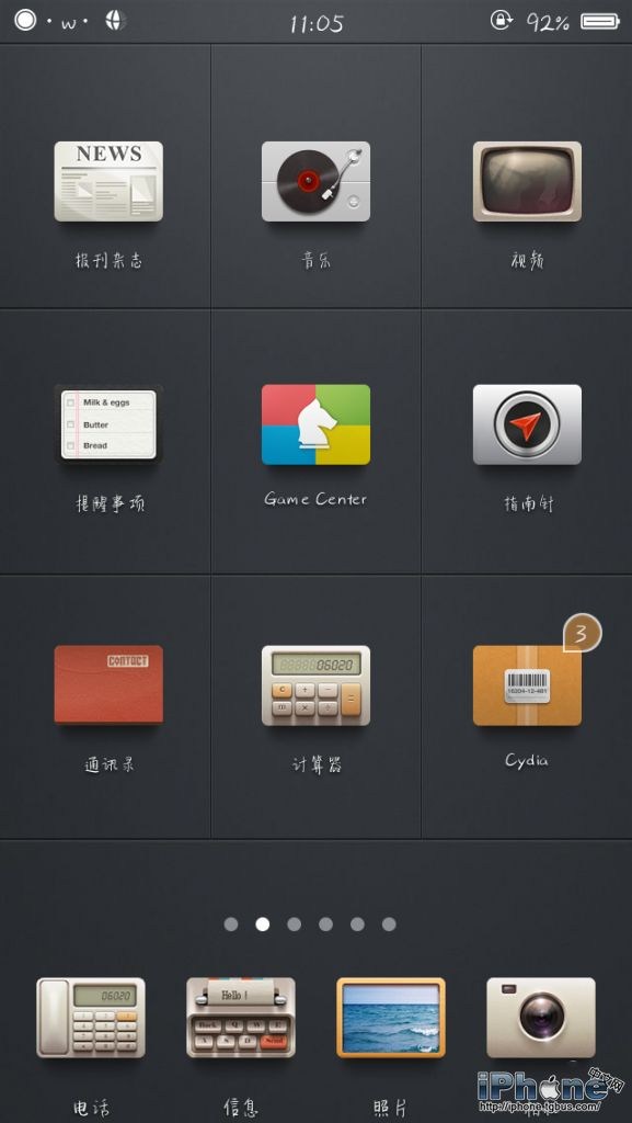 【巴士數碼】對於Winterboard主題來說,不少越獄用戶並不陌生。目前的iOS主題越來越多,當然不少是收費的。隨著主題越來越多,相信不少朋友也都在忙碌的挑選著自己心意的主題。如果你並不喜歡扁平化,而是喜歡擬物風格的。今天iPhone中文網為你推薦的主題肯定合你的口味。這款主題是在Primus HD主題的基礎上修改而來的。下面一起來欣賞一下這款主題吧!
