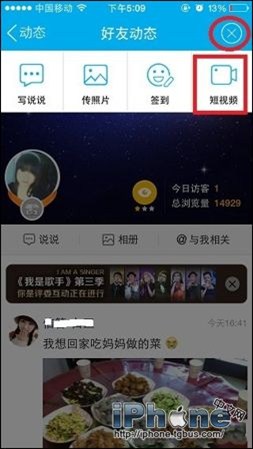 1.登陸扣扣,打開好友動態頁面,在好友動態頁面,點“+”號,之後點擊“短視頻“,如圖: