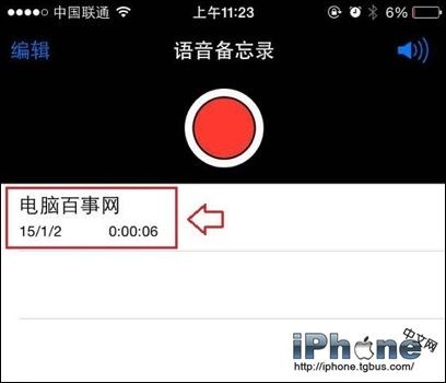 2、點擊名為“電腦百事網”的iPhone6錄音名稱後,下方會彈出幾個操作按鍵,我們點擊第一個【分享】圖標,如下圖所示。
