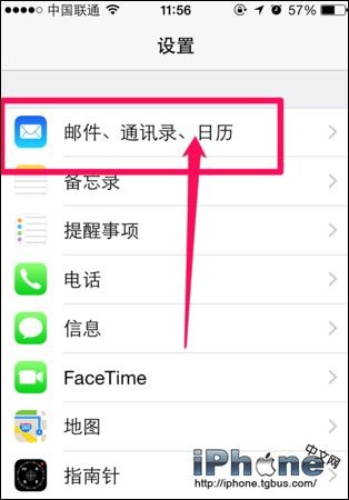 1、打開蘋果iPhone6手機【設置】,點擊【郵件、通訊錄、日歷】找到日歷相關選項。