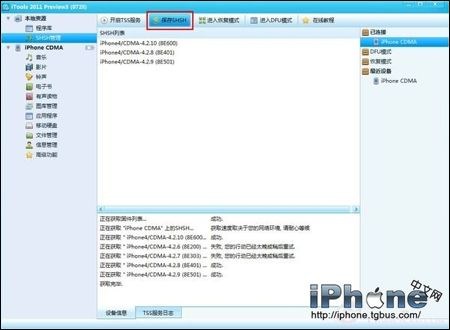 3、要先關閉iTunes(小雨傘), 開啟TSS服務,按鈕就在【保存SHSH】左邊。