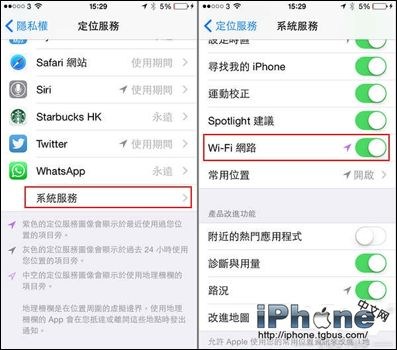 2、然後在設置中繼續點擊【隱私】→【定位服務】→【系統服務】,撥一下 WiFI 網絡關閉 WiFi 定位服務。