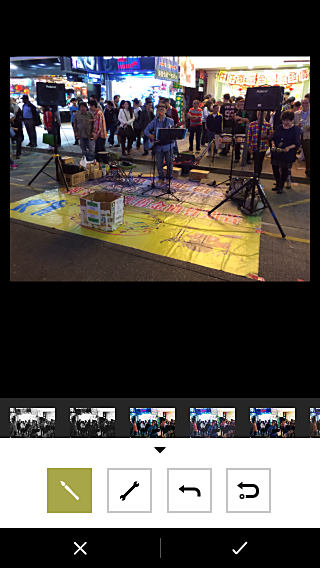 點擊界面下方的三角按鈕彈出其他功能按鈕,畫筆代表濾鏡,扳手代表濾鏡之外的其他調節功能,此部分在後文介紹,而另外兩個按鈕表示撤銷一步和重做。