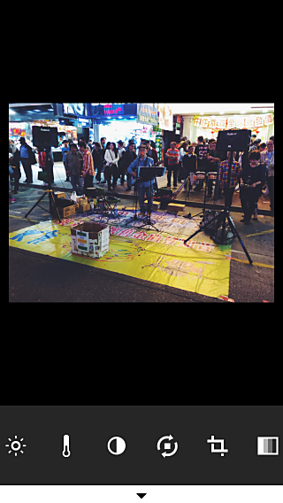 ▲曝光度、色溫、對比度、旋轉、裁剪、色調
