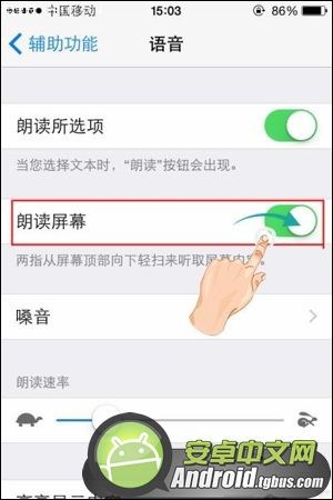 2、在打開的“輔助功能”—“語音”—“朗讀屏幕”之後我們點擊它打開。