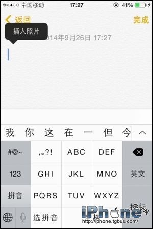 2、在編寫備忘錄時,長按時就會看到“插入照片”的選項了,然後選擇需要插入的照片即可。