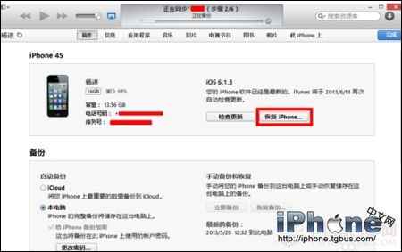 5、在 iPhone 摘要頁面,按住鍵盤上的“shift”鍵,再點擊“恢復 iPhone”按鈕,如圖所示;