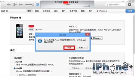7、接下來 iTunes 會提示我們將會抹掉一切內容,還將會與 Apple 服務器驗證恢復。點擊“恢復”按鈕,如圖所示;