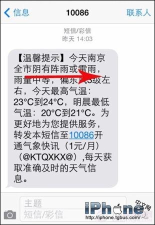 在信息閱讀界面中,從左側向右滑動,便會回到列表界面,無需點擊上面的“信息”按鍵,而且在閱讀頁面從右向左滑動,則可以查看該條信息的時間。