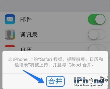 4、等待系統驗證Apple ID與密碼的正確性,當驗證成功以後即會自動打開 iCloud 功能,並且會提示我們是否要合並蘋果6手機上的數據,建議點擊“合並”按鈕。
