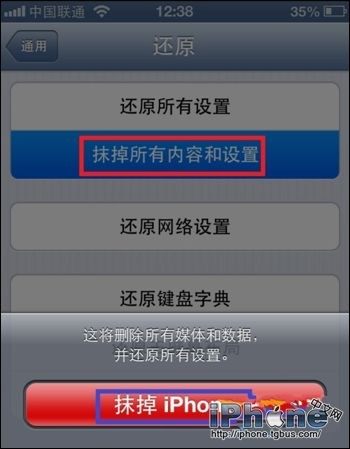 4、然後在還原面板中點擊“抹掉所有內容和設置”。點擊紅色的“抹掉 iPhone”按鈕,如圖所示。