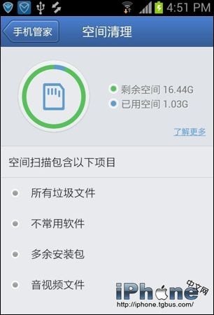 3、如果說害怕刪錯使用清理軟件可以達到相同目的,我推薦你使用騰訊手機管家,具備垃圾清理功能,清理文件緩存,殘留文件等功能,一樣有效。
