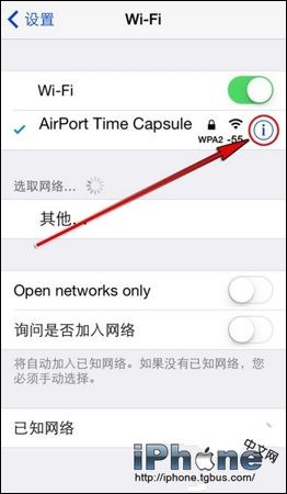 3、連接上可用的 Wi-Fi 網絡後,然後點擊 Wi-Fi 網絡名稱右方的「顯示信息」按鈕(字母「i」)。