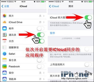 2、返回“iCloud”界面後,即可根據自己的使用需要將相關應用程序的iCloud共享開啟,比如郵件、通訊錄、提醒事項等。當然,開啟照片的雲存儲是一定需要的。