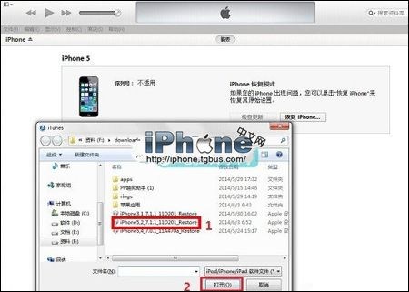 5、接下來就是我們比較常見的刷固件操作上,同時按住鍵盤上的shift鍵+iTunes上的“恢復”,然後浏覽選擇下載好的iOS7.1.2固件,如下圖所示: