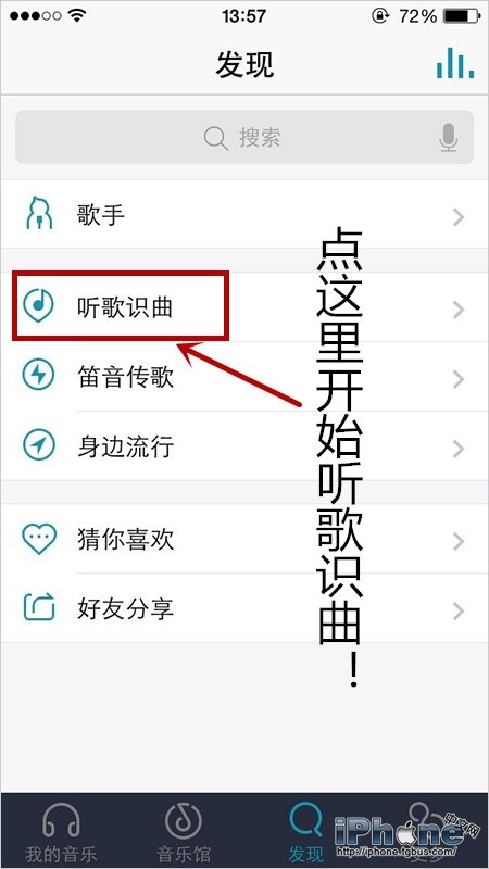 首先,當你聽到一首好聽的歌曲時,請打開QQ音樂,而後請點擊屏幕右下方的發現;
