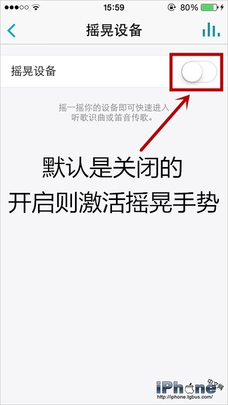 該開關默認是關閉的,若你開啟的話,就能通過晃動設備的方式來快速激活聽歌識曲啦!