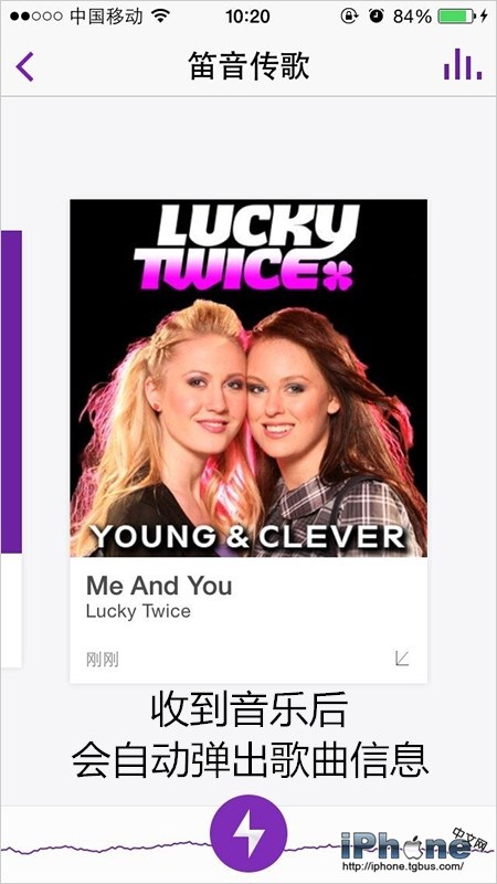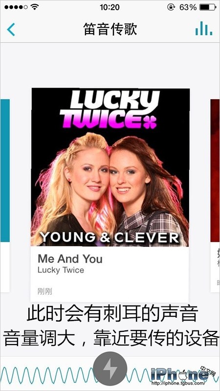 此時點一下下方的閃電標識,此時會出現一陣笛音(真的是噪音啊喂!)然後靠近朋友的設備;注意:請不要帶耳機,同時音量盡量調大,離接受設備也盡量近一些!