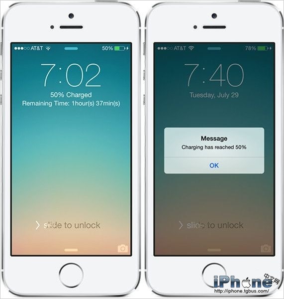 你需要知道這款插件的第一個功能就是為iOS7系統增加了新的充電功能。當你的iOS設備充電到一定的量的時候,你將會接收到提醒距離充電完成還剩下多少時間的通知。而且你還能對提示的風格以及鎖屏的字體顏色的進行設置,這些設置都可以在這款插件的專屬面板找到。