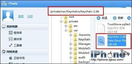 2、然後打開iTools工具,然後在左側菜單欄找到“文件系統”,依次打開/private/var/keychains/,在keychains文件夾下我們會看到keychain-2.db文件,為防止意外,建議先將其導出備份至電腦中,以備出了問題,可以及時還原恢復。備份方法為:選擇該文件,然後點擊上方導出,保存至電腦即可。