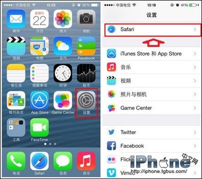 1、 首先進入iOS7主界面,然後找到“設置”並點擊進入,然後在“設置”裡邊找到“Safair浏覽器設置“,並點擊進入,如下圖所示:
