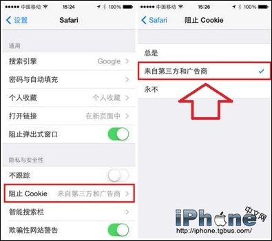 2、進入Safair浏覽器設置後,我們再選擇進入“阻止Cookie設置”,之後選擇“來自第三方和廣告商”或者“永不”,即可。