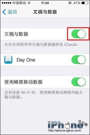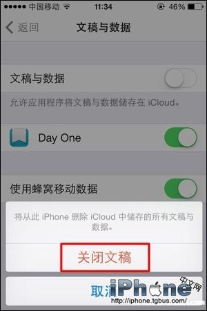 5、在提示“將從此iPhone刪除iCloud中儲存的所有文稿與數據。”選項中點擊“關閉文稿”,這樣就可以禁用掉iCloud同步選項中的iWork套件了。