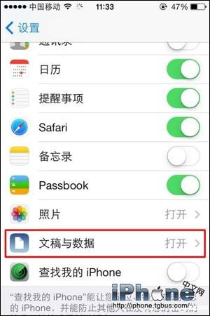 3、在iCloud列表中找到“文稿與數據”選項,點擊進入。