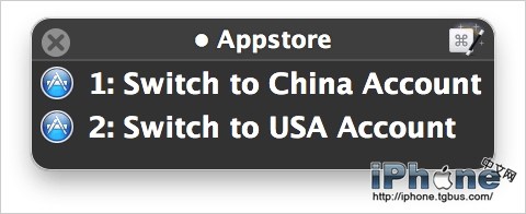 此 Group 我設置了只對 iTunes、Mac App Store 有效,並對 Group 和 Macro 都定義了快捷鍵。如果我想切換到中國店,先按 command+e 再按 1 就 ok 了(按 command+e 後會出現如下所示列表)。