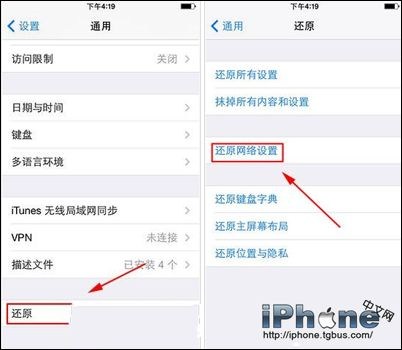 2、在“通用”中往下拉,我們可以看到“還原”,點擊進去,然後點擊“還原網絡設置”,接下來手機會重啟一次,重啟完成之後,就可以正常的使用網絡了。