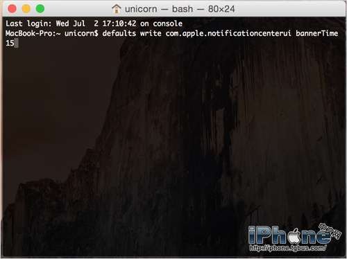 打開終端(找不到的點擊 Mac 屏幕右上角放大鏡按鈕,Spotlight 搜索 “終端”),粘入下面這行命令,回車就行了。注意最後的 # 替換成你希望通知中心橫幅停留的秒數,比如 15。