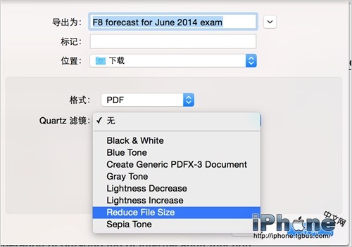 用 預覽.app 打開你要壓縮的 PDF(如果你沒做什麼設置或者裝其他軟件的話,雙擊 PDF 就默認以它打開),在屏幕頂部菜單欄選擇「文件」>「導出」。點擊三角形按鈕展開導出選項,文件名、位置什麼的自己選,在最後那個「Quartz 濾鏡」欄裡選擇「Reduce Flie Size」就行。