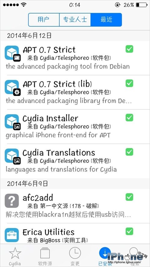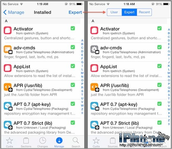 舊版Cydia管理界面“已安裝”中的簡單/專家功能切換開關現在直接顯示在“已安裝”的頂部。此外,新版Cydia還增加了“最近安裝”功能,讓用戶可以查看最近安裝的軟件。