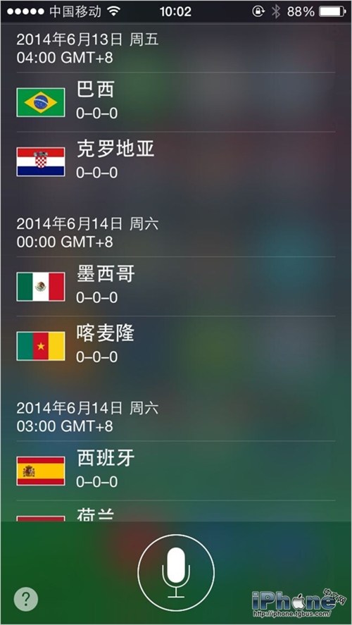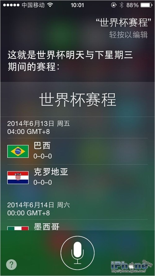 世界杯來了!面對這全世界球迷四年一次的狂歡節,我們怎能錯過任何一場重要的比賽!那麼查賽程最簡單的方法是什麼?打開應用查看?不不不,現在就長按你的Home鍵激活Siri,然後對它說出“世界杯賽程”試試吧!