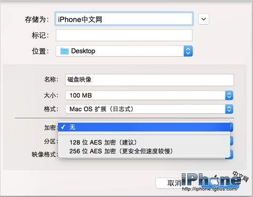 蘋果電腦Mac OS X系統下加密文件的選項有3個:不加密,128位AES加密和256位AES加密。
