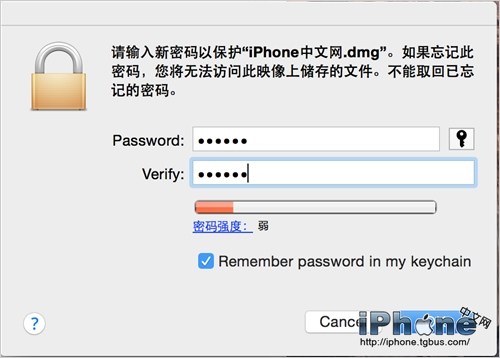 選擇一種加密方式(128位AES加密足夠了)輸2次密碼,注意,那個“驗證”不是什麼驗證碼或是密碼提示問題,只是再輸一次密碼(這個漢化翻譯的很郁悶)。建議不要選擇“在我的鑰匙串記住密碼”。