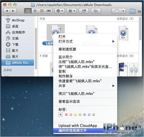 蘋果電腦Mavericks系統裡,右擊一個視頻文件,右鍵菜單裡選擇 “編碼所選視頻文件”。