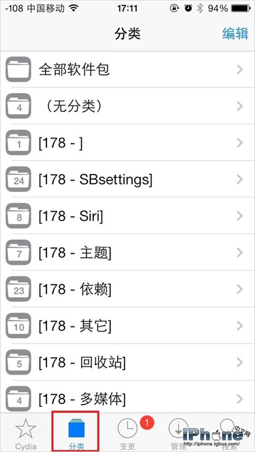首先讓我們打開Cydia,在最下面找到分類(這裡以178源舉例);