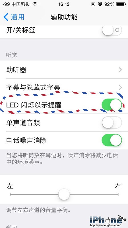 第三步:在【輔助選項】中我們會看到【LED閃爍以示提醒】選項,選擇打開。