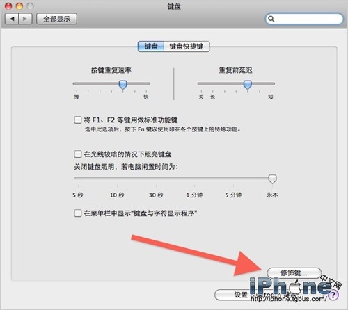 點擊 Mac 屏幕左上角的蘋果標志,選擇“系統偏好設置…”,點擊“鍵盤”。在鍵盤設置面板裡點擊“修飾鍵…”