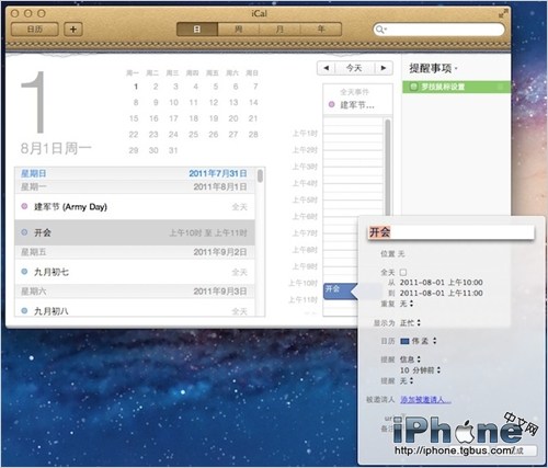 最新的Mavericks系統大大改進了 iCal 的智能性,點擊 “+” 添加新日程時,只需輸入類似 “明天上午十點開會” 這樣的一段話,iCal 就會自動創建一項日程/待辦事項,標題為 “開會”,時間是第二天 10:00。當然不一定是明天,周五、x月x日等時間詞都可以。