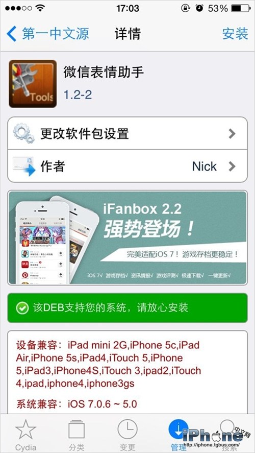 首先要確保你的iPhone已越獄,然後點開Cydia—管理—178源,找到微信表情助手這個插件並安裝;