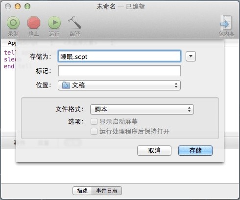 進入「Finder」>「應用程序」>「實用工具」>「AppleScript 編輯器」,粘入下面這三行命令(不懂代碼你也能看懂),保存。只要自己找得到,存成什麼名字和位置都行。