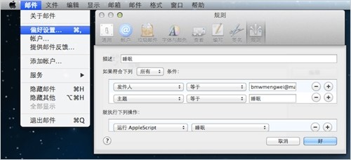 打開 郵件.app,從菜單欄的 「郵件」>「偏好設置」>「規則」裡新建一個規則。如上圖所示,「發件人」是你自己的郵箱,「主題」睡眠、Sleep 什麼的都行。在「執行下列操作」那裡選擇運行剛才做的那個讓 Mac 睡眠的 AppleScript,老系統直接去 Finder 裡選,新系統只能執行郵件指定目錄裡的 AppleScript 了,把文件拖入系統指定的那個文件夾裡即可。