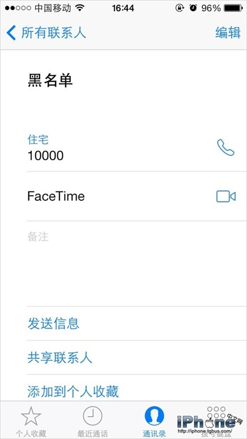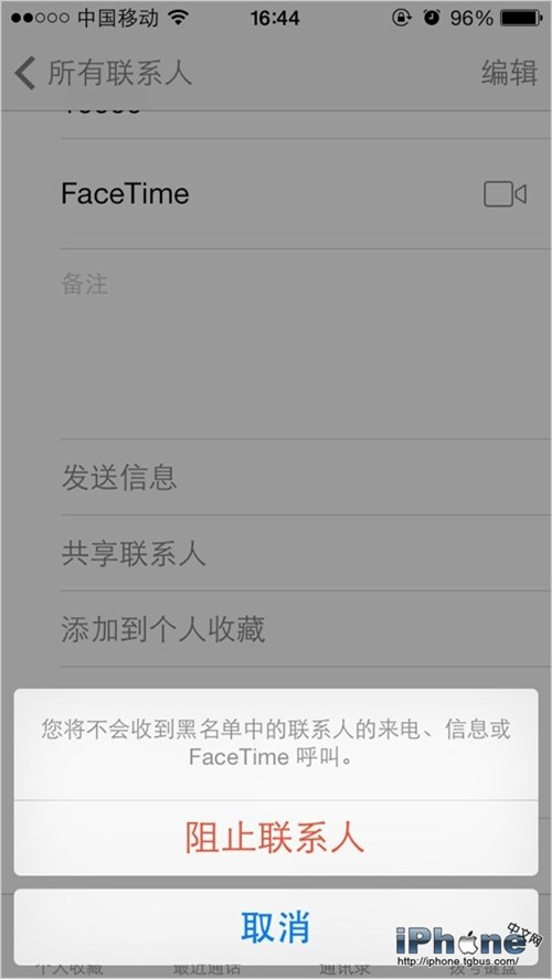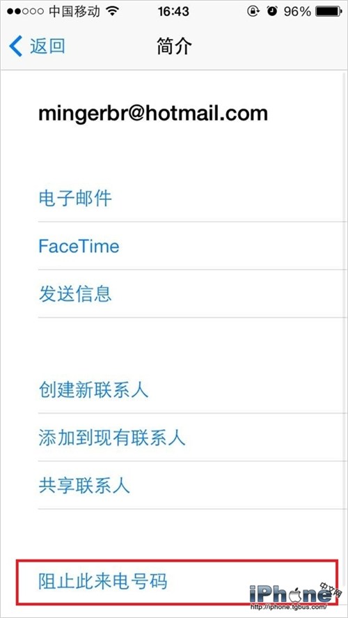 3.進入“通訊錄”,點擊想屏蔽的聯系人後,下拉菜單就能看到“阻止此來電號碼”,選擇後便可屏蔽此聯系人的電話、信息、郵件或是Facetime;