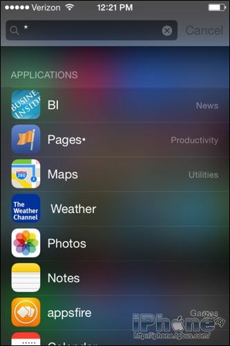 1、iOS 7的Spotlight搜索功能已經被轉移到了主屏幕中,用戶可以在主屏幕的任意窗口做出下滑手勢進行搜索。而且,如果用戶在搜索框中輸入“星號鍵”的話還可以查看該設備上所有已安裝的應用程序。