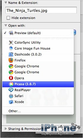 2. 找到Open with項,在下面的下拉菜單中就是所有可以選擇的程序,選擇你希望默認打開的程序。