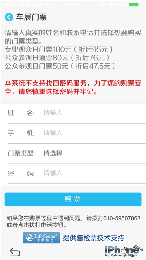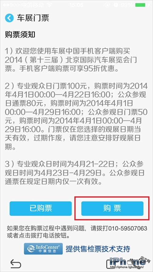 車展組委會顯然已經考慮到了這個問題,所以本屆北京車展除了采用現場購票、網上訂票等傳統售票渠道,還首次開通了更加方便的App優惠購票,優惠幅度為9.5折。這種購票方式只需要消費者用手機掃描官方二維碼,並進入購票模塊填寫相關購票信息,成功付款後即可獲得電子門票,在車展當天有個專門的檢票通道,掃描手機電子票即可進館參觀。但值得注意的是,每部裝客戶端的手機只能購買一張優惠車展門票。