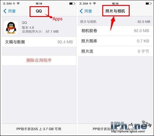 需要注意的是,[照片與相機]列表顯示了相機膠卷、照片圖庫和照片流都占用了多少空間,但是,卻不能單獨刪除。刪除照片最快的方法是連接到iTunes,導入照片,然後刪除。